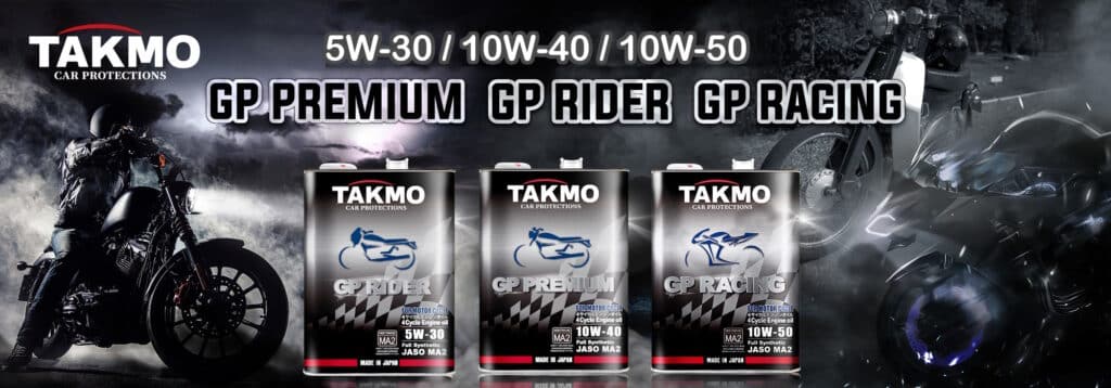 粘度ラインナップはカブなどの小型バイク用に「GP RIDER 5W-30」、中型~大型バイクのツーリング用途に「GP PREMIUM 10W-40」、中型~大型バイクのスポーツ走行向けに「GP RACING 10W-50」をご用意しています。TAKMOは、あらゆるライディングシーンに応えていきます。